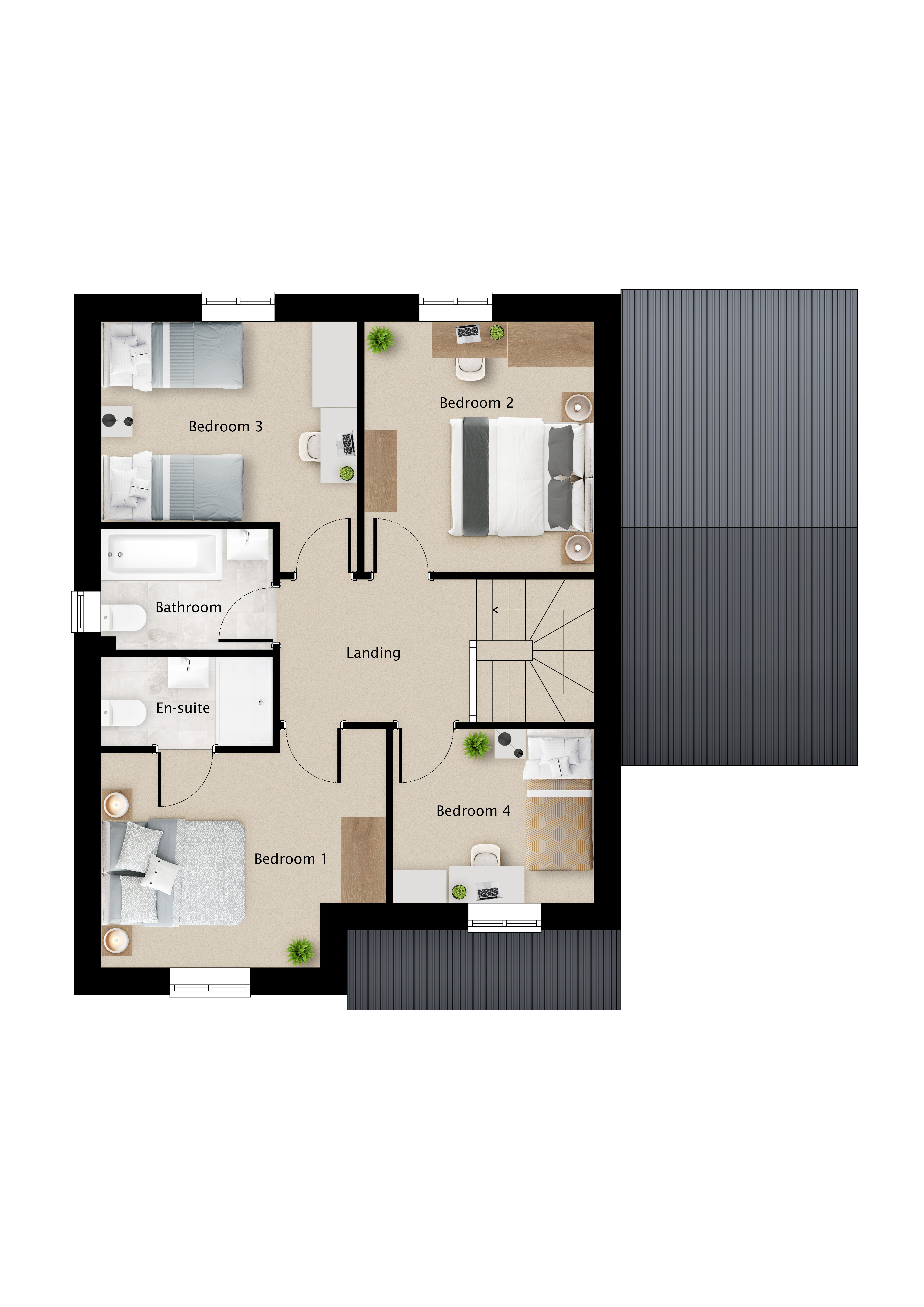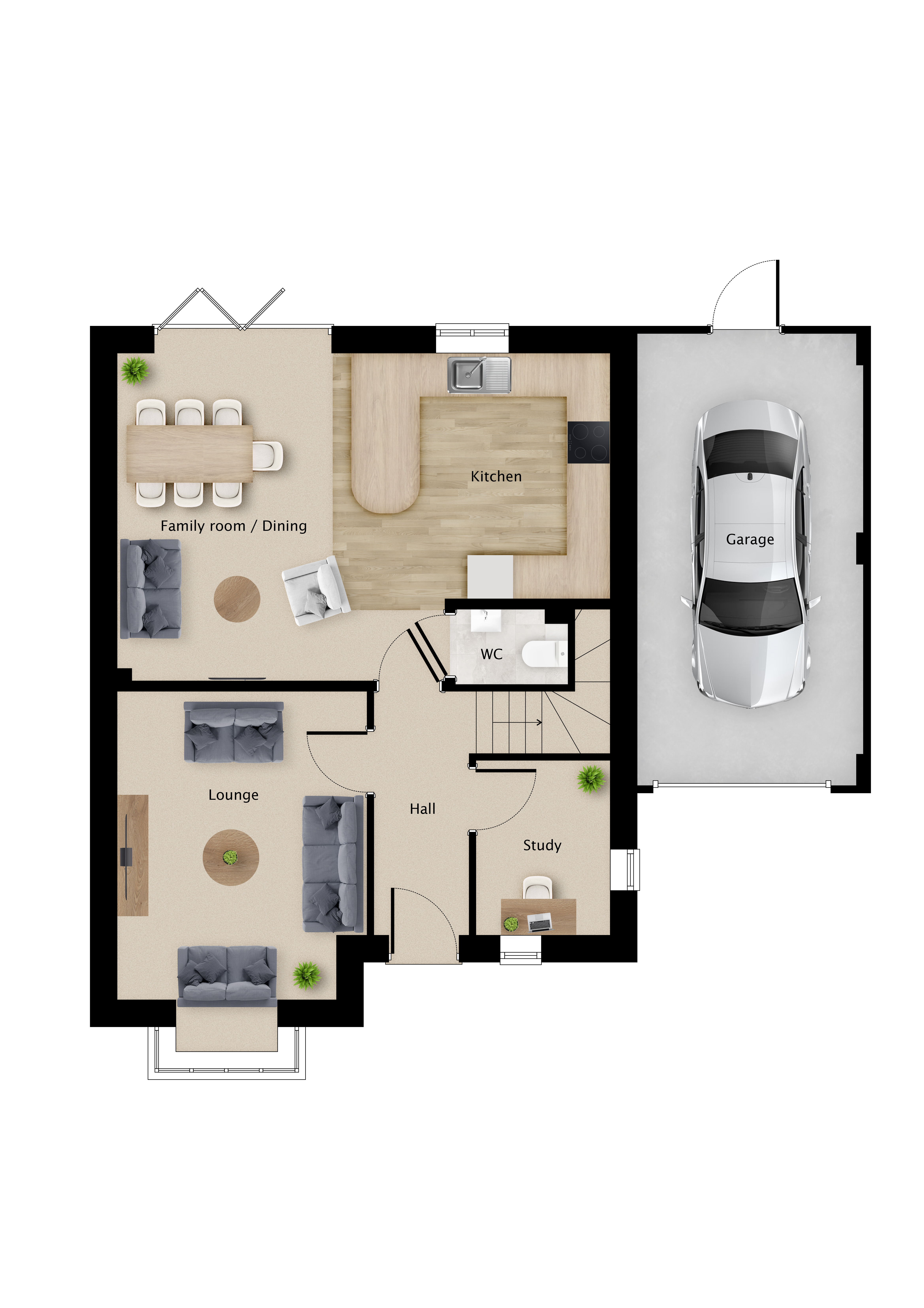This detached house features four bedrooms and includes a single garage. Upon entering, you're welcomed by an entrance lobby that provides access to the staircase leading to the first floor. The ground floor includes a study, a lounge, and an expansive open-plan kitchen and dining area, complete with double French doors that open onto the enclosed rear garden. In addition, there is a utility area with a door that connects to the garage.