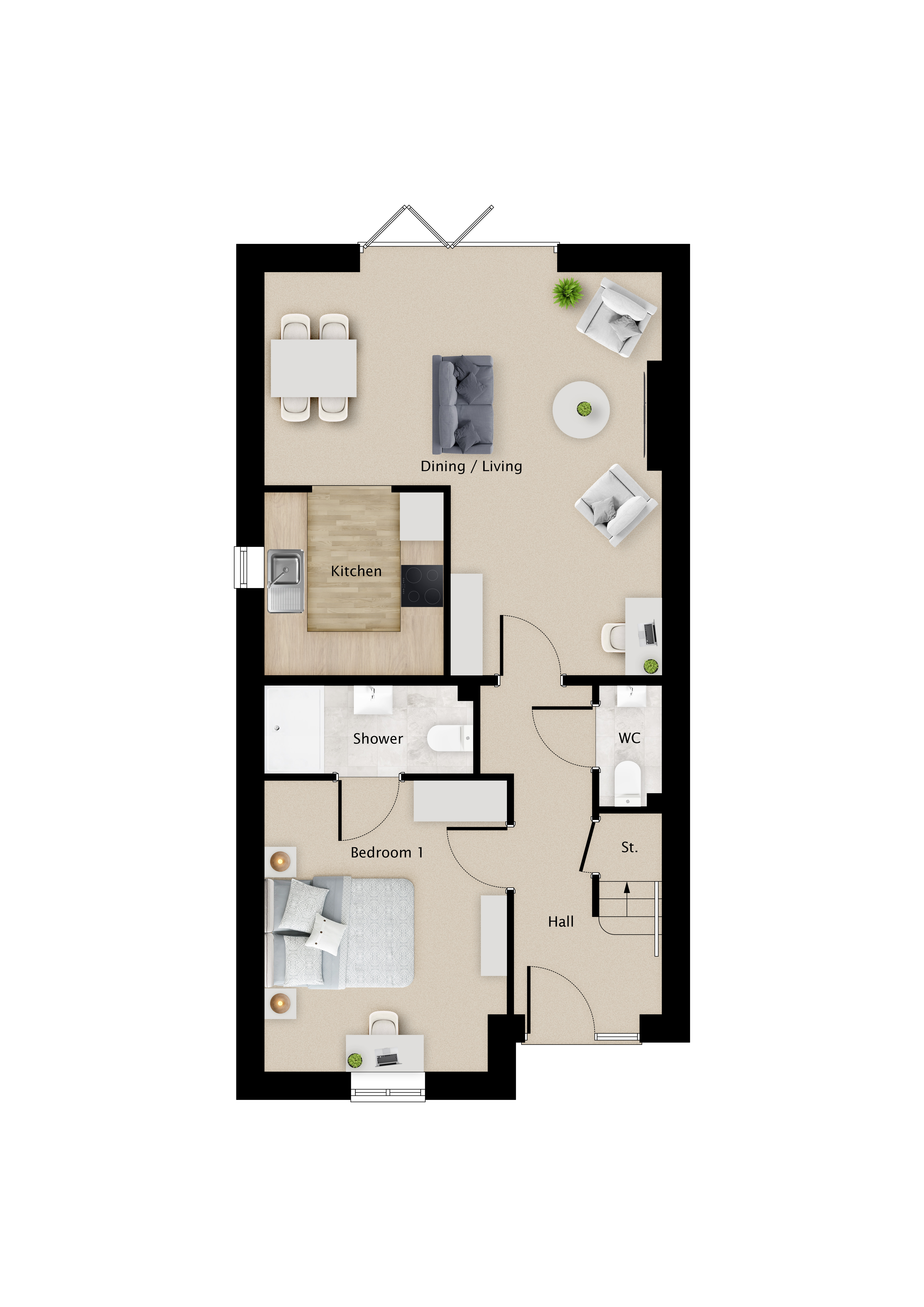 On the ground level, you’ll find a convenient cloakroom and a separate shower room. The first bedroom is also located on this floor, along with a well-equipped kitchen and a spacious open-plan lounge and dining area. Bi-fold doors open out to the rear garden, creating a seamless indoor-outdoor living experience.